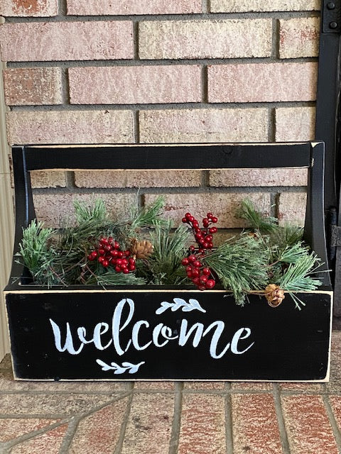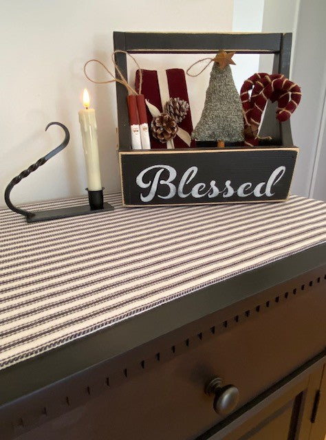 Decorative Solid Wood Tote Set of Two. Totes are handcrafted of solid wood and painted black. There is a white stenciled saying of "Welcome" on the large tote and "Blessed" on the smaller tote. Each has stars on the sides made of wood. Great for displaying home decor items. Large Measures 17"L x 8"W x 4.5"Deep, and 12" High with handle. Small Measures 10.5"L x 6"W x 3" Deep, and 10" High with handle. Made in the U.S.A. Lancaster County, PA. *Because this item is individually made by hand slight variations may occur. It has a distressed look.