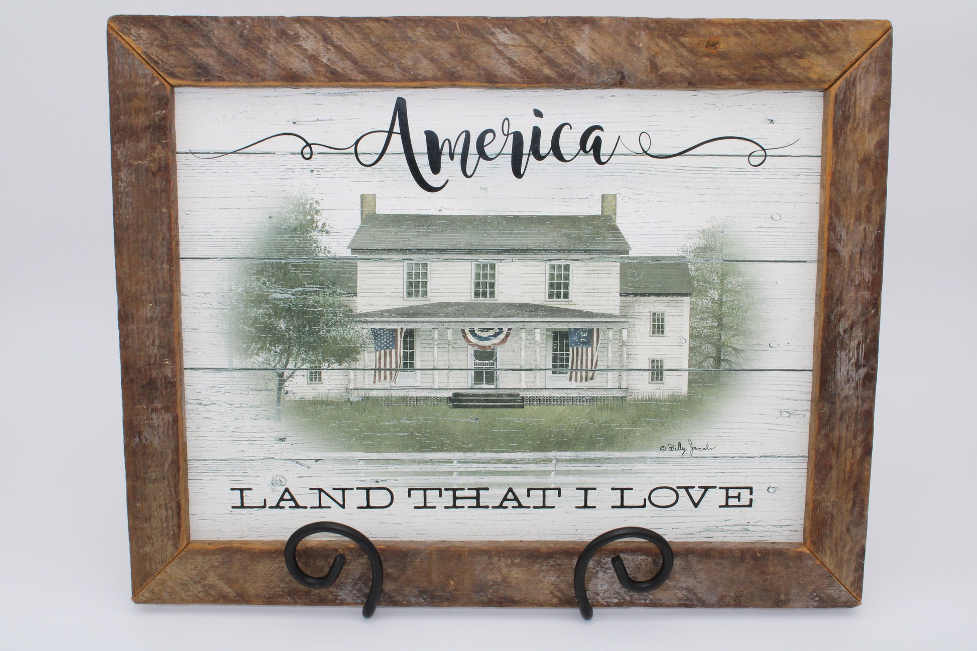 Iron Easel Stand with Scroll Design artwork holder. Item is made of iron and is powder coated black. Great for holding and displaying small to medium sized artwork. Measures 9.5"H x 9"W at the bottom, 7" deep at the bottom. Fits one inch thick artwork pieces. Made in the U.S.A. Lancaster County, PA *Third picture shows optional smaller easel located in our catalog. Art work sold separately and is available in our catalog as well.