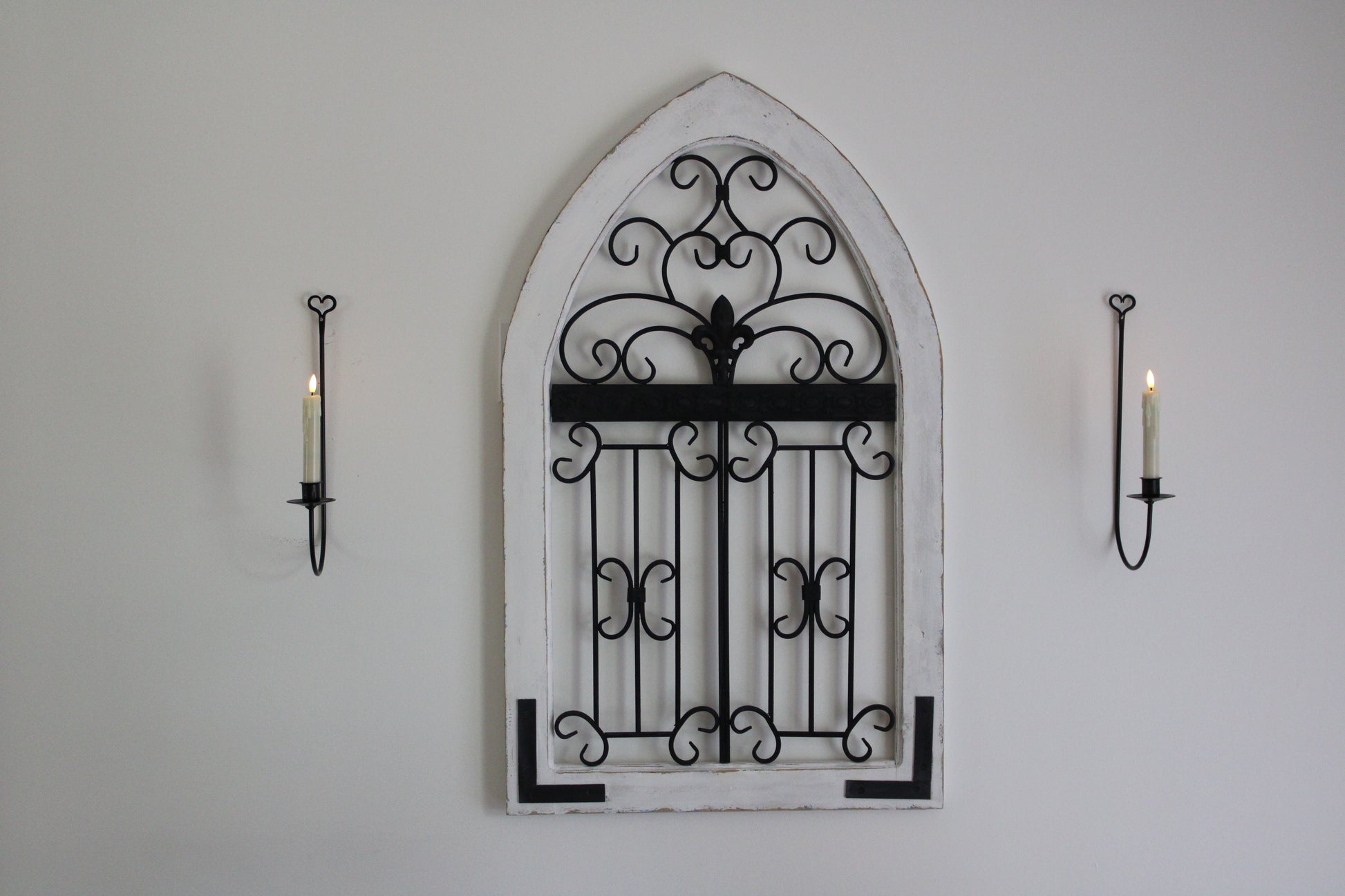 Iron Sconce Taper Candle Holder with Heart. Sconce is a hook style with a cute heart at the top. Looks great on any wall. Item measures 15" Tall. This item matches our heart topped iron paper towel holder for sale in our catalog (Shown in third picture of this listing). Handcrafted in Lancaster, PA USA. Because they are handcrafted slight variations may occur. Candle not included. Sconces Sold Individually