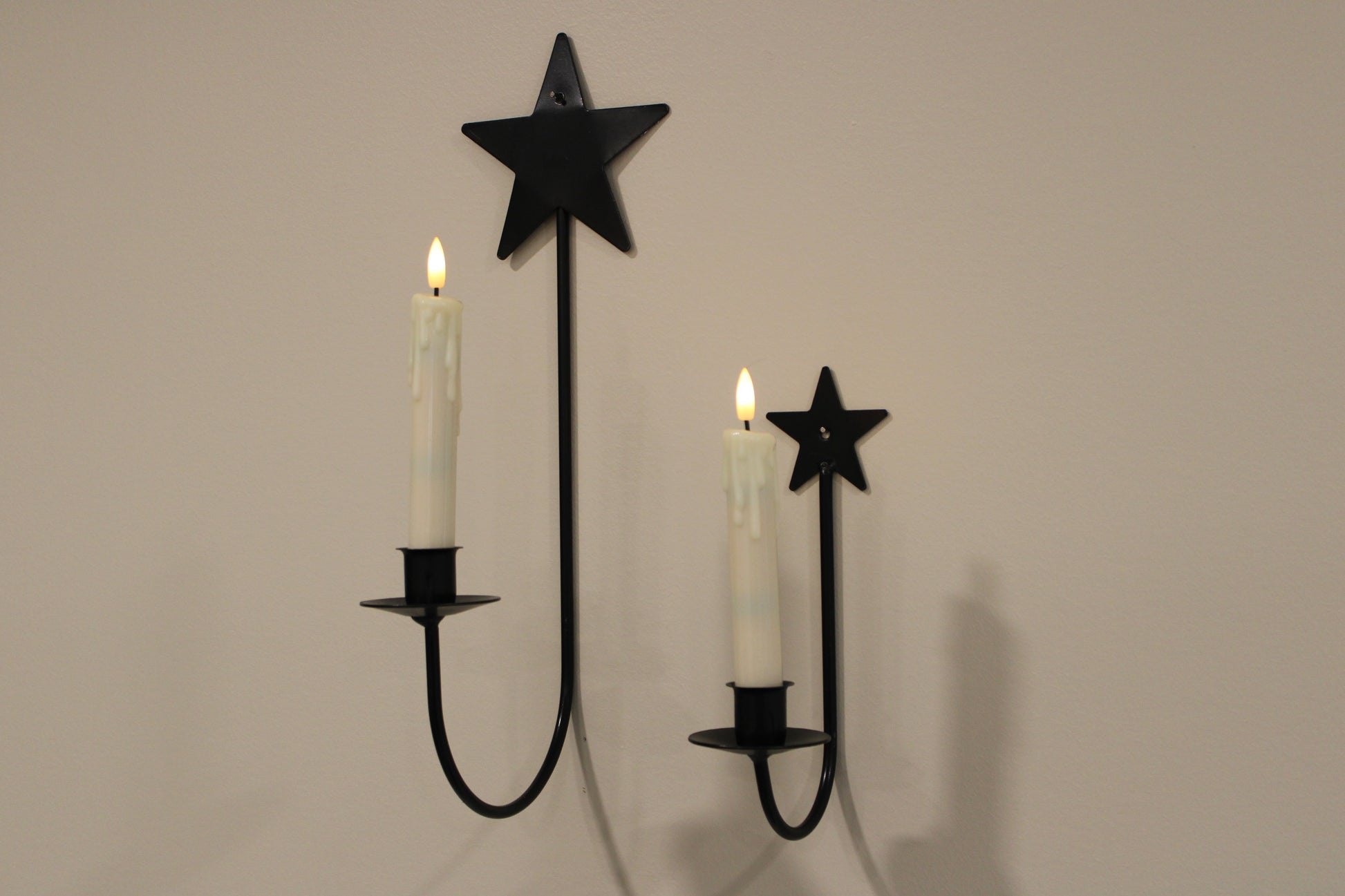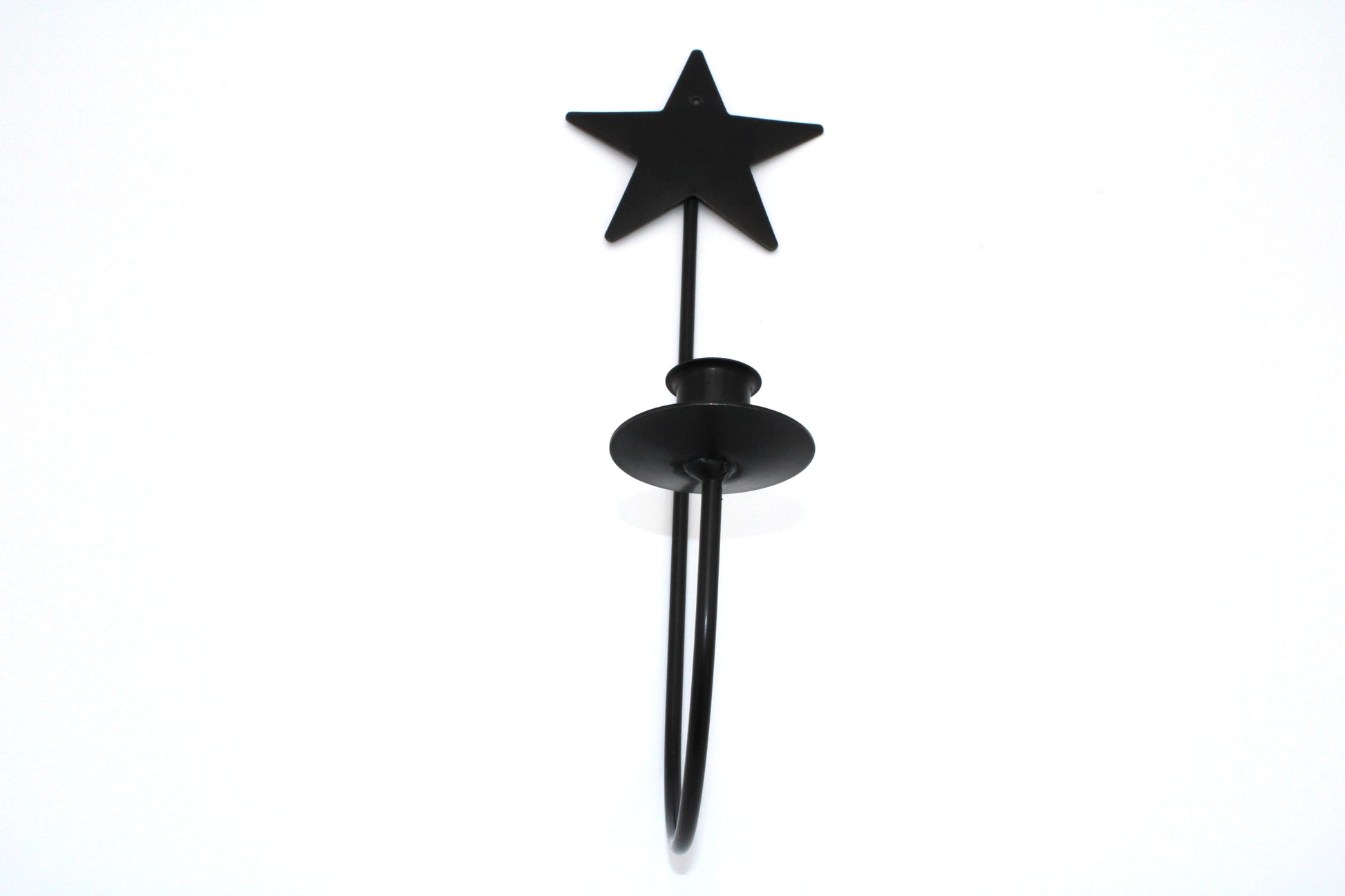 Iron Sconce Taper Candle Holder with Star. Sconce is a hook style with a star at the top. Looks great on any wall. Item measures 15.75" Tall. Shown with small size sconce on second and fourth picture of this listing. Handcrafted in Lancaster, PA USA. Because they are handcrafted slight variations may occur. Candles not included. Sconces Sold Individually.