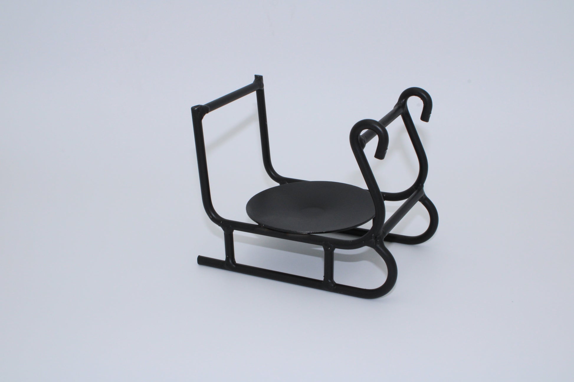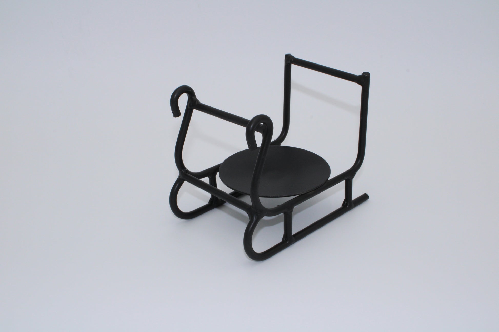 Handcrafted with charm in Lancaster County, Pennsylvania, this black iron sled is a cute and versatile decoration for the winter season. The sled serves as a unique pillar candle holder, perfect for creating cozy, winter scenes on your bookshelf, mantle, or tabletop. Pictured with other decor items not included.
