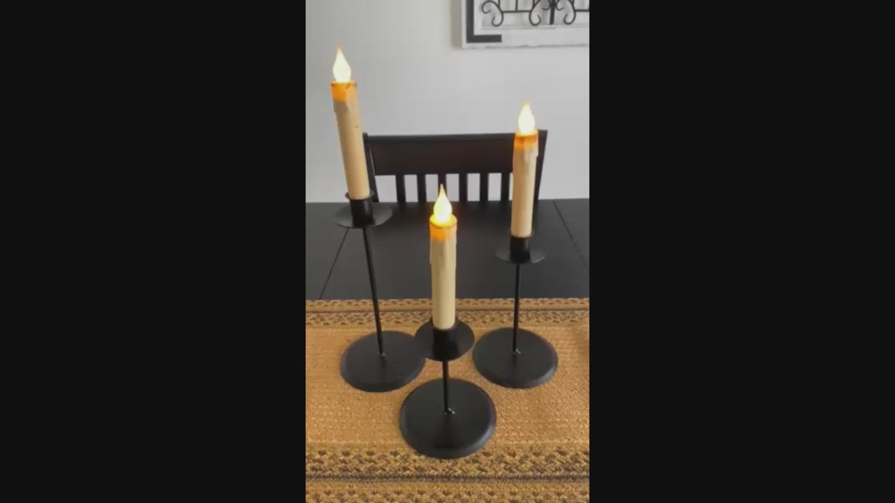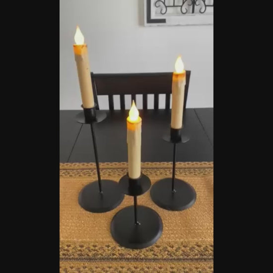 Elevate your home décor with this set of three hand-forged iron raised taper candle holders, crafted with passion in Lancaster, PA USA. Varying heights – Large (10"H), Medium (8"H), and Small (5.75"H) – all with a consistent 4.5" base, allow for dynamic arrangements that enhance any space. Experience the warmth and artistry these individual pieces bring to your living space. Taper candles, which come in a variety of styles and colors to match your taste, are sold separately. Other accent pieces shown are not included.
