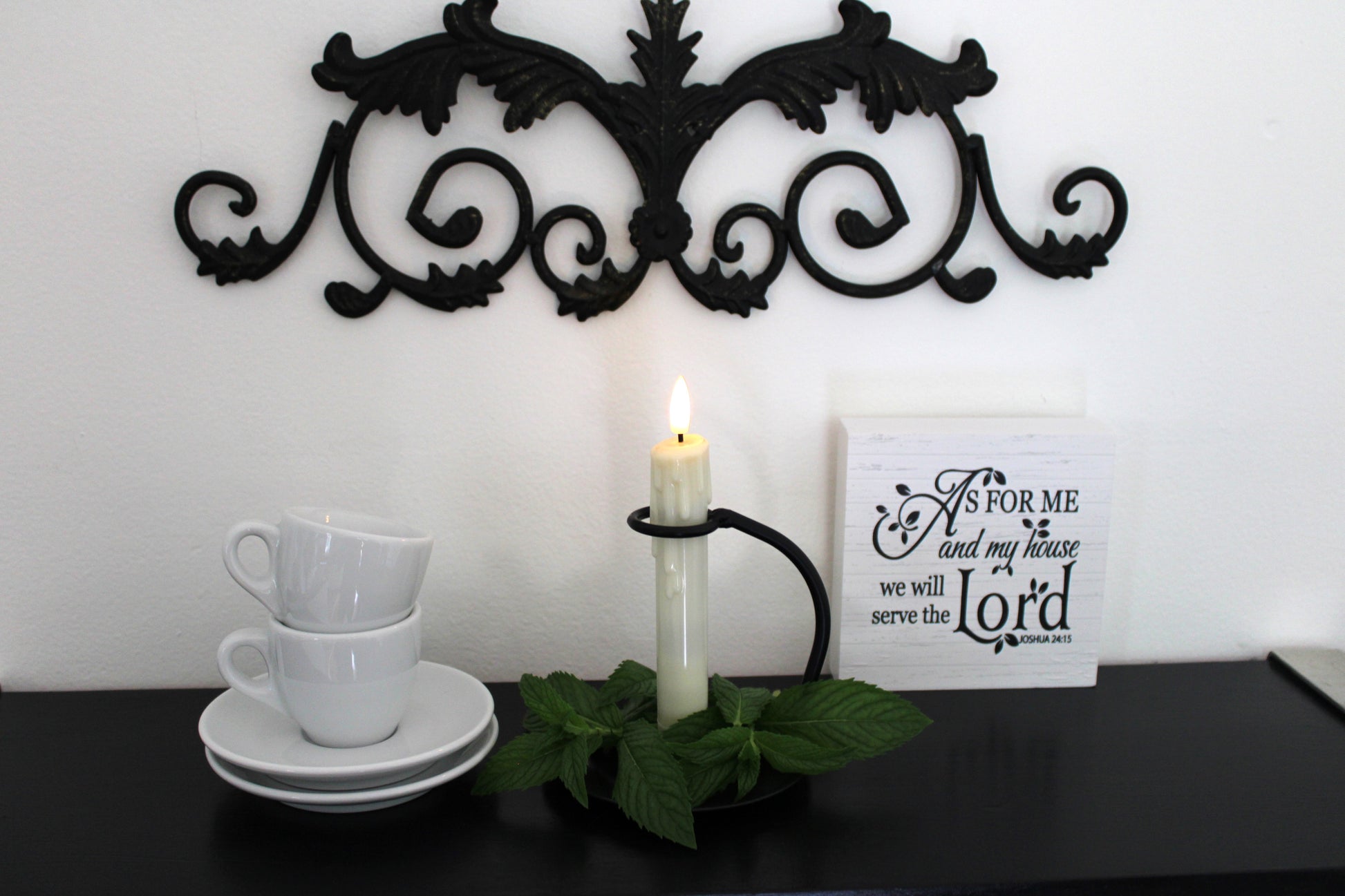 Iron Taper Candle Holder with Plate. This candle holder has a base plate that holds a decorative ring. Add a decorative ring in your unique style. Decorative ring and candle not included. Measures 5"T x 4.5" base plate diameter. Handcrafted in Lancaster, PA USA. Because item is handcrafted slight variations may occur.
