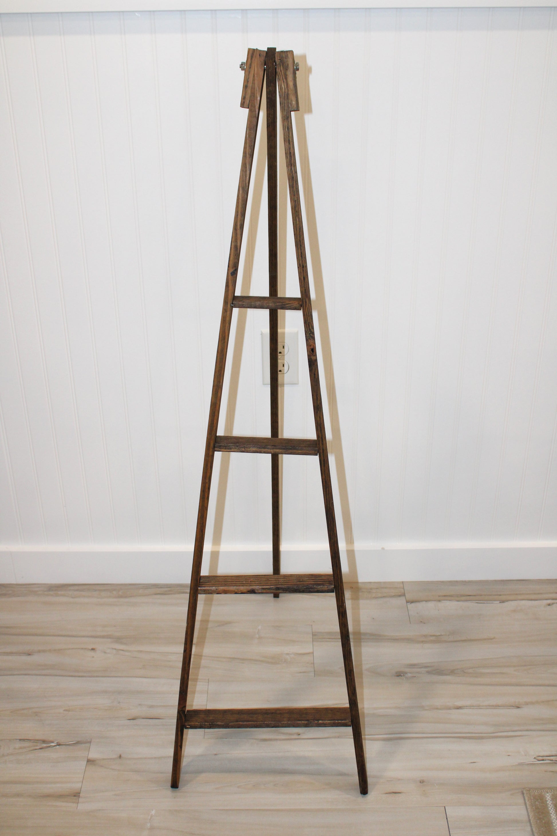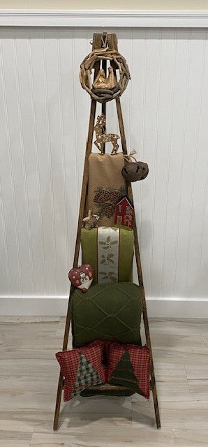 Lath Wood Decor Ladder with Stand is made of thick solid lath wood and is stained brown. Great for displaying small decorative items or small linens. It measures 46"H x 13""W at the bottom and tapers to 2.5"W at the top. Stand swings back. Made in the U.S.A. Lancaster County, PA. * Because this item is individually made by hand slight variations may occur. It has a distressed look. Sold as ladder only, other items not included.