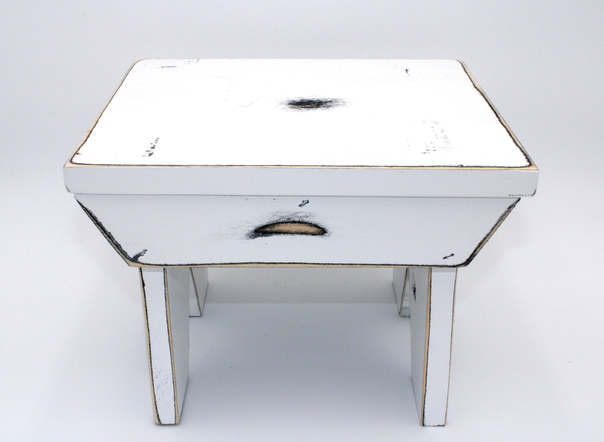 Solid Wood Stool Plant Stand is hand crafted. Comes in black or white. Measures 12"L x 11"W x 9" High. Made in the U.S.A. Hand crafted in Lancaster County, PA. * Because this item is individually made by hand slight variations may occur. It has a distressed look. * Stool is for decoration only and should not be used to stand on.