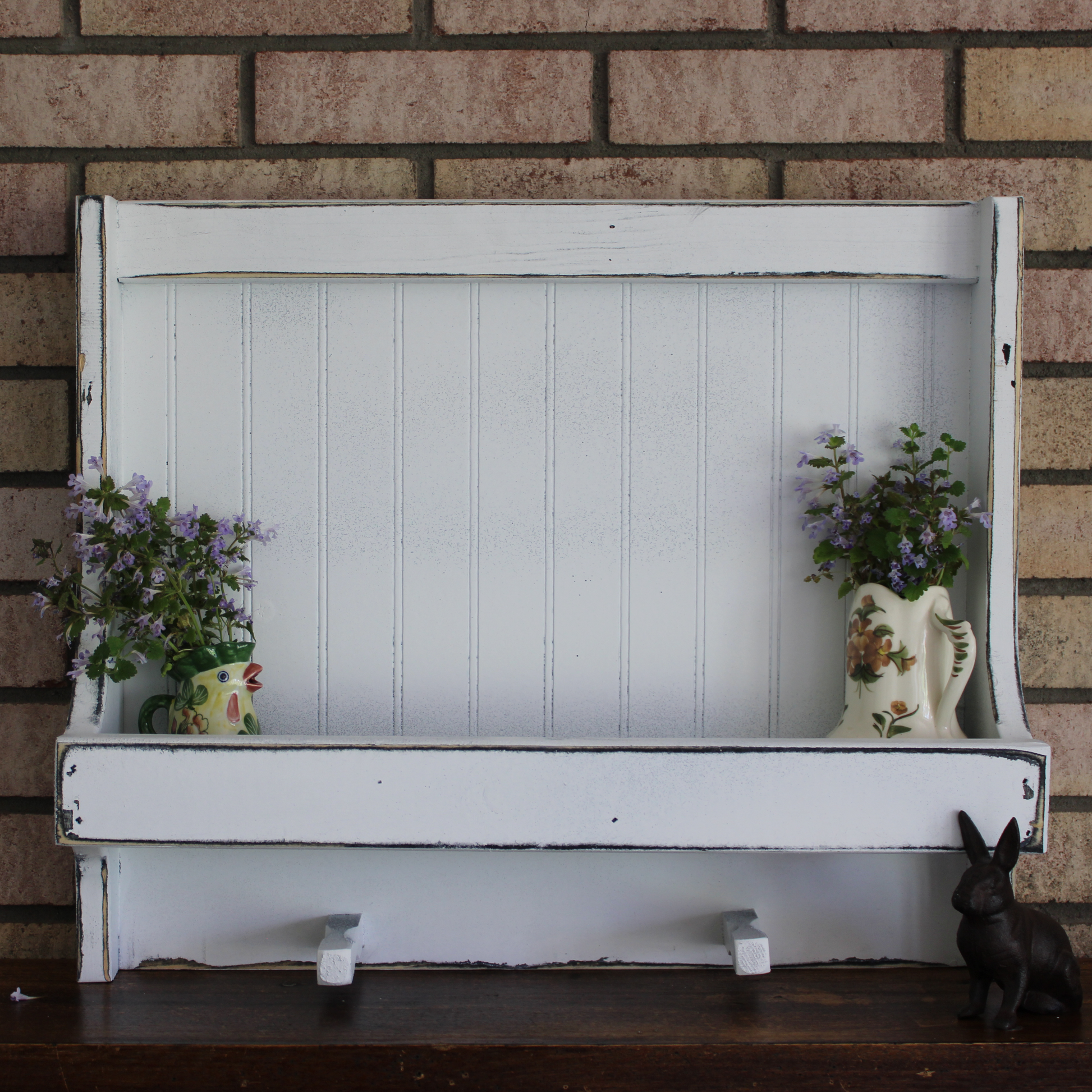 Two Peg Shelf Rack Wall Accent is made of solid wood. Great for displaying home decor items or small potted plants. It has two pegs for hanging light weight items. Measures 21"L x 18"H x 5"W. Shelf is 21"L x 4"W x 1" Deep. Hangs on the wall with sawtooth hangers. Made in the U.S.A. Lancaster County, PA. * Because this item is individually made by hand slight variations may occur. It has a distressed look.