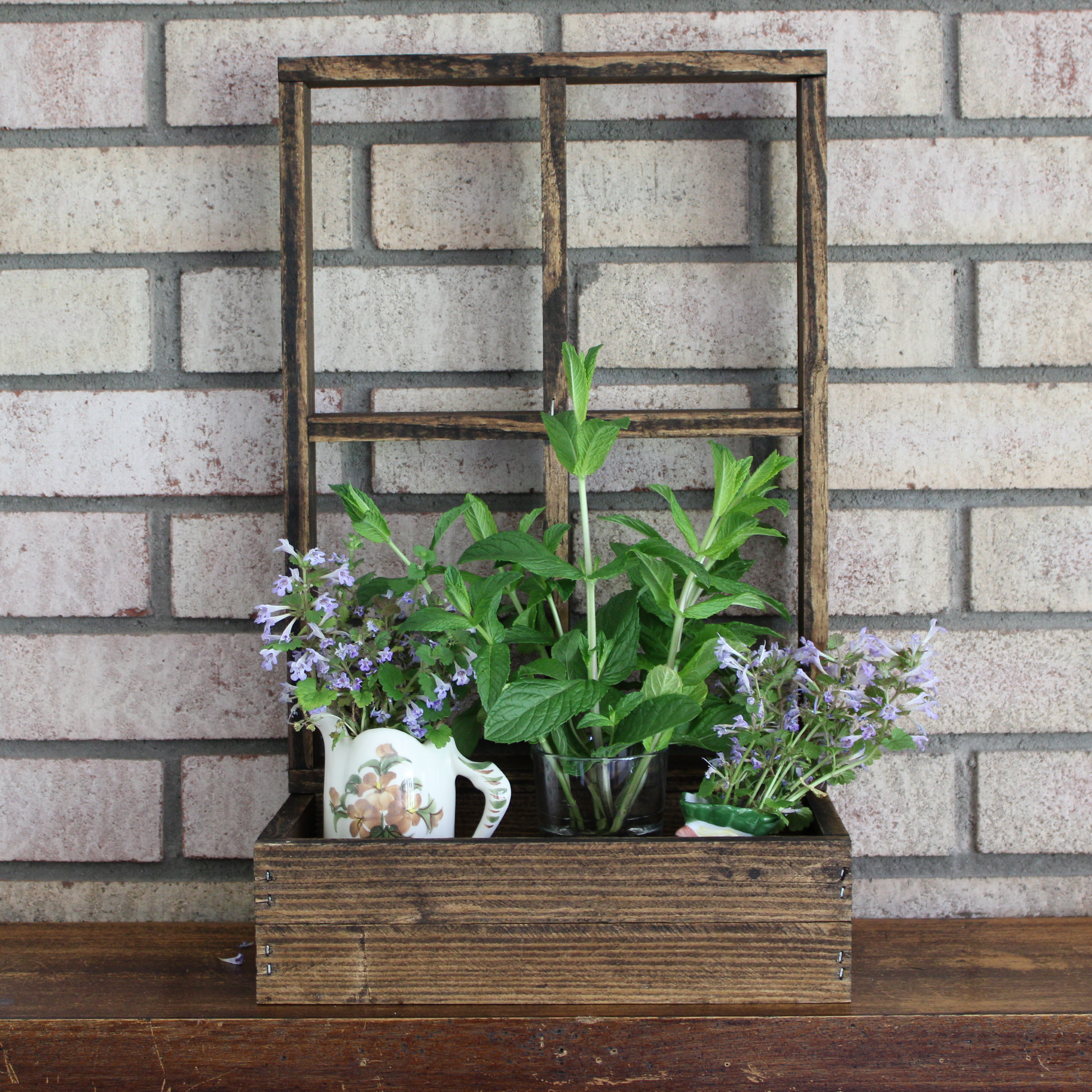 Window Frame Flower Box is handcrafted of solid wood. It is finished in a medium dark walnut stain. It measures 18"H x 11"L x 6.5"W x 3"Deep. Made in the U.S.A. Handcrafted in Lancaster County, PA. *Because this item is individually made by hand slight variations may occur.